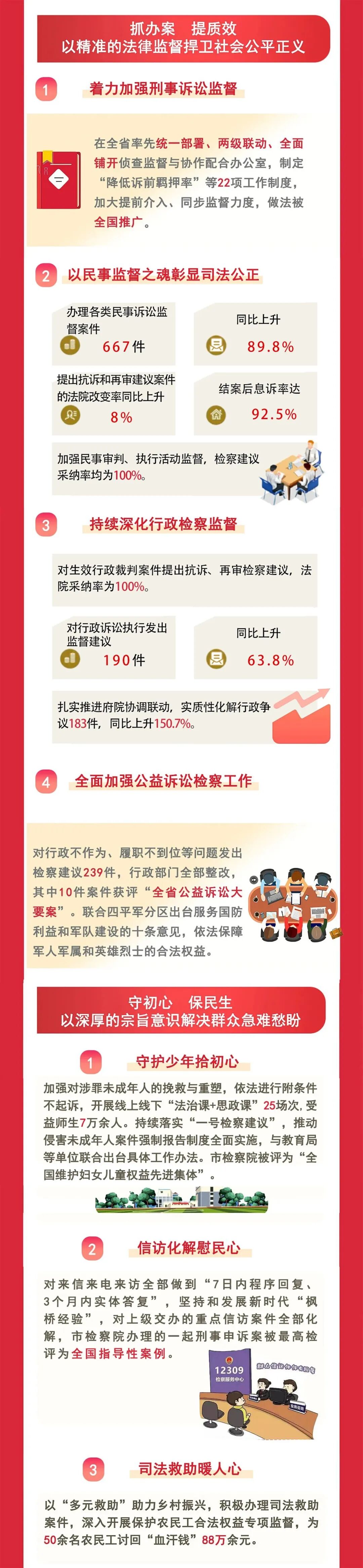 全市检察机关坚持以习近平新时代中国特色社会主义思想为指导,认真学习贯彻党的二十大精神,全面落实《中共中央关于加强新时代检察机关法律监督工作的意见》,强化法律监督、忠实能动履职,切实为大局服务、为人民司法、为法治担当,积极构建“一四五七”工作新格局,各项检察工作在新起点上迈出新步伐,有28个集体、56名个人受到市级以上表彰,服务企业、化解信访、典型案例、央媒报道等工作实现了新突破。