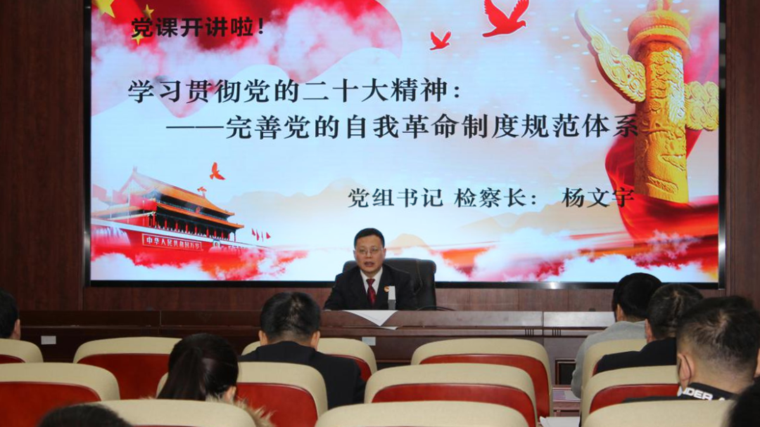杨文宇检察长围绕党的自我革命制度规范体系在新时代全面从严治党伟大实践中形成发展;党的自我革命制度规范体系发自党的初心使命,凝结新时代重大理论创新、实践创新、制度创新;坚决贯彻落实党的二十大战略部署,继续完善党的自我革命制度规范体系等三个方面进行详细解读。杨文宇强调,完善党的自我革命制度规范体系,着眼坚定不移全面从严治党、深入推进新时代党的建设新的伟大工程作出的战略部署,为党在长期执政条件下践行初心使命、始终赢得人民拥护,带领人民为实现第二个百年奋斗目标而团结奋斗提供了重要遵循,为做好新时代检察工作指明了前进方向。要把深入学习宣传贯彻党的二十大精神作为当前和今后一个时期的首要政治任务,结合全年工作任务同步谋划进行学习,要原原本本学、结合活动学、联系实际学,把党的二十大精神内化于心、外化于行,落实到具体行动和工作实践中。