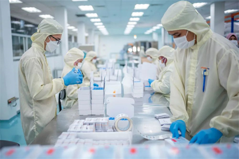 2021105日,在马来西亚吉隆坡郊区的发马公司灌装工厂,工人在包装本地灌装生产的科兴疫苗。新华社记者 朱炜 摄